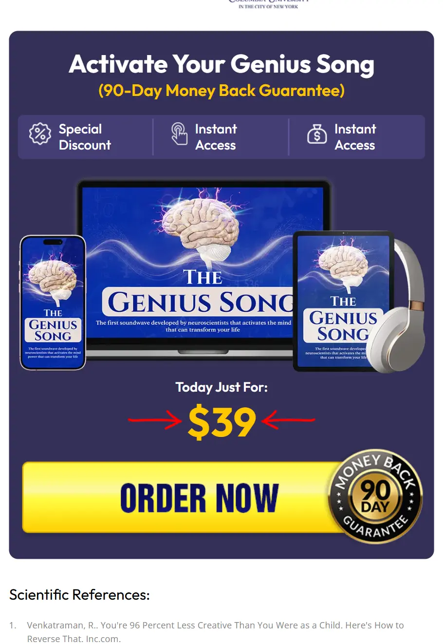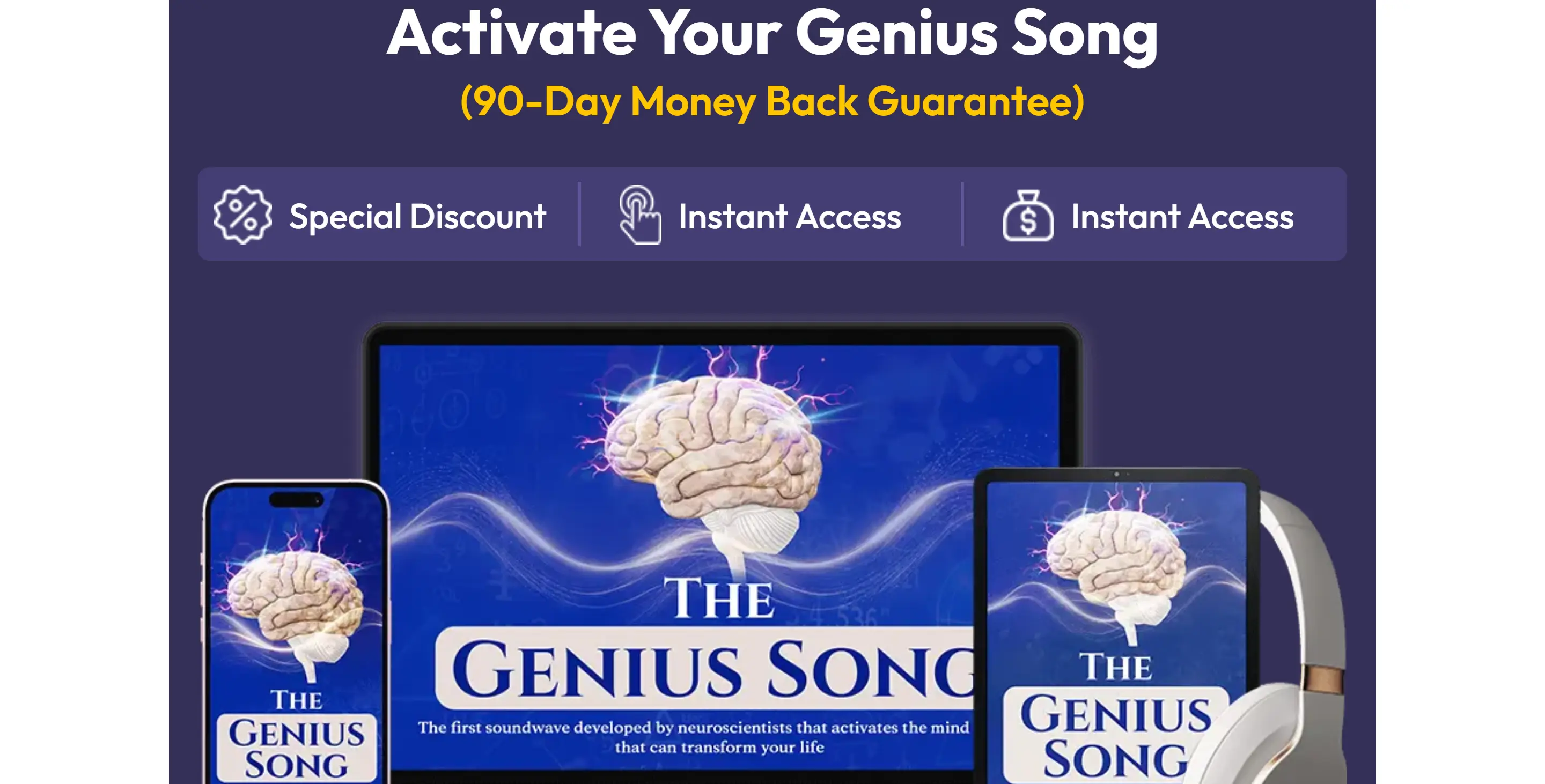 The Genius Song™ is marketed as a short audio track designed to use sound-pattern “brain entrainment” to support a focused mental state. When you click the button below, you’ll be taken to the official video presentation (VSL) — and the purchase button is located directly below the video on that page.